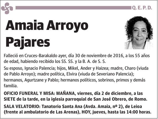 Falleció en Cruces-Barakaldo ayer, día 30 de noviembre de 2016, a los 55 años de edad, habiendo recibido los SS. SS. y la B. A. de S. S.