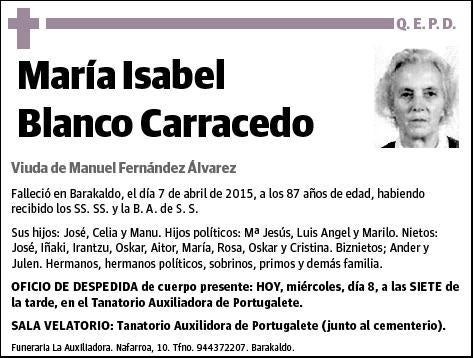 Falleció en Barakaldo, el día 7 de abril de 2015, a los 87 años de edad, habiendo recibido los SS. SS. y la B. A. de S. S. Sus hijos: José, Celia y Manu. Hijos políticos: Mª Jesús, Luis Angel y Marilo. Nietos: José, Iñaki, Irantzu, Oskar, Aitor, María, Rosa, Oskar y Cristina. Biznietos; Ander y Julen. Hermanos, hermanos políticos, sobrinos, primos y demás familia.