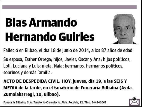 Falleció en Bilbao, el día 18 de junio de 2014, a los 87 años de edad. Su esposa, Esther Ortega; hijos, Javier, Oscar y Ana; hijos políticos, Loli, Luciana y Luis; nieta, Naia; hermanos, hermanos políticos, sobrinos y demás familia. ACTO DE DESPEDIDA CIVIL: HOY, jueves, día 19, a las SEIS Y MEDIA de la tarde, en el tanatorio de Funeraria Bilbaína (Avda. Zumalakarregi, 10, Bilbao).