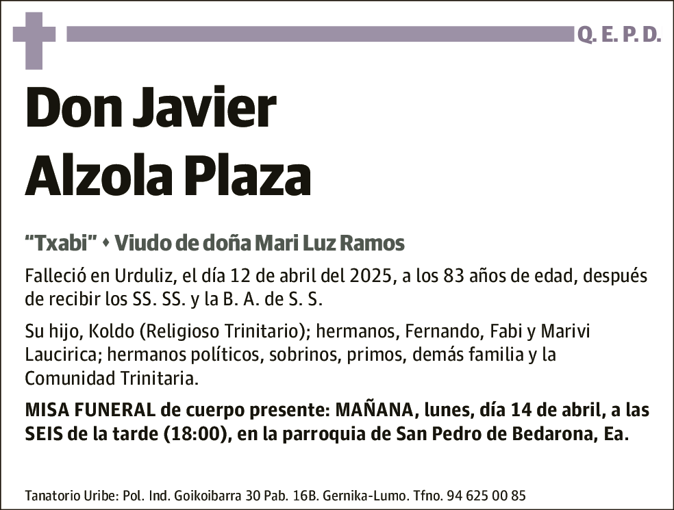 Falleció en Urduliz, el día 12 de abril del 2025, a los 83 años de edad, después de recibir los SS. SS. y la B. A. de S. S.