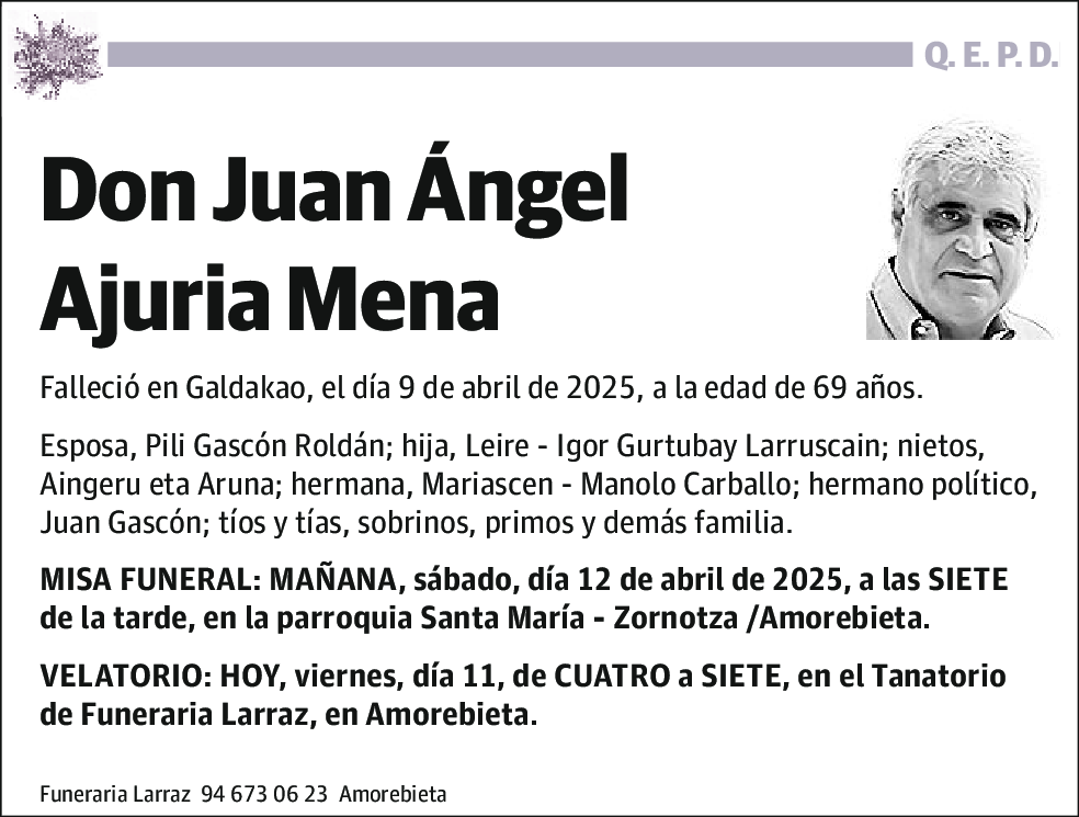 MISA FUNERAL: MAÑANA, sábado, día 12 de abril de 2025, a las SIETE de la tarde, en la parroquia Santa María - Zornotza /Amorebieta.