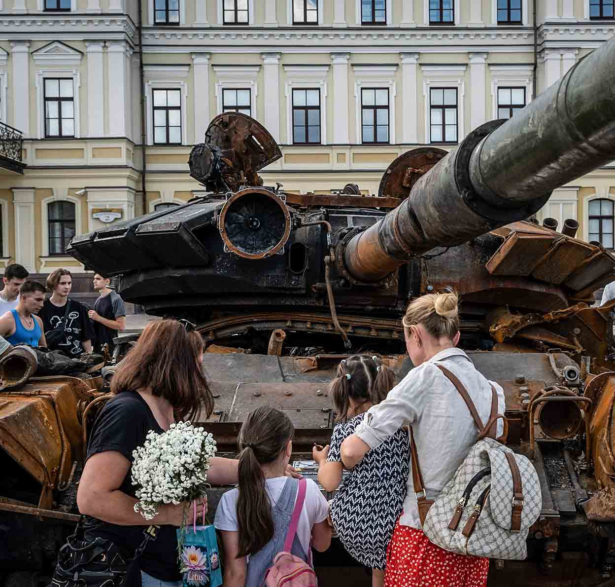 La invasión rusa deja rastros de los planes frustrados de Putin de conquistar Kiev y las principales ciudades del país. Mientras la vida cotidiana regresa a la capital, los restos de la contienda van quedando al margen. Pero el gobierno ha decidido colocar algunos de ellos en pleno centro, como símbolo de la victoria. Los tanques rusos se exhiben, se fotografían... y se cohabita con ellos.