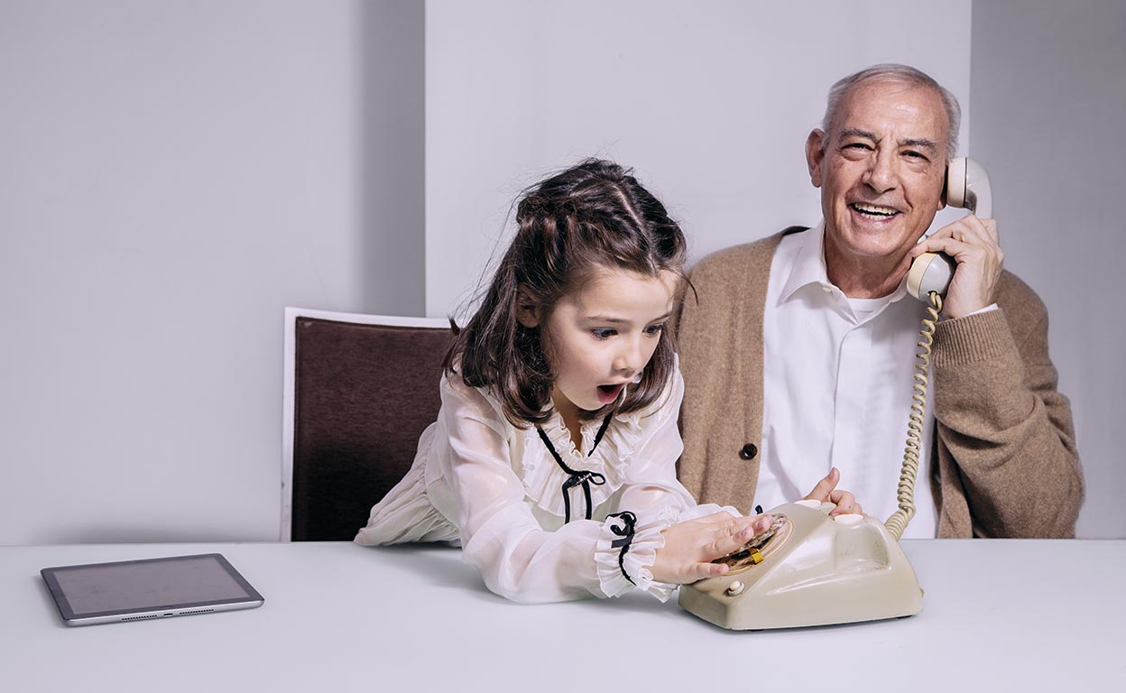 María: «¿Qué es esto? ¿Un reloj?». La sorpresa de esta niña de 5 años es auténtica. Es la primera vez que ve un teléfono así, con dial, en manos de su abuelo. María aún no sabe qué quiere ser de mayor: «Inventora de medicamentos o youtuber».