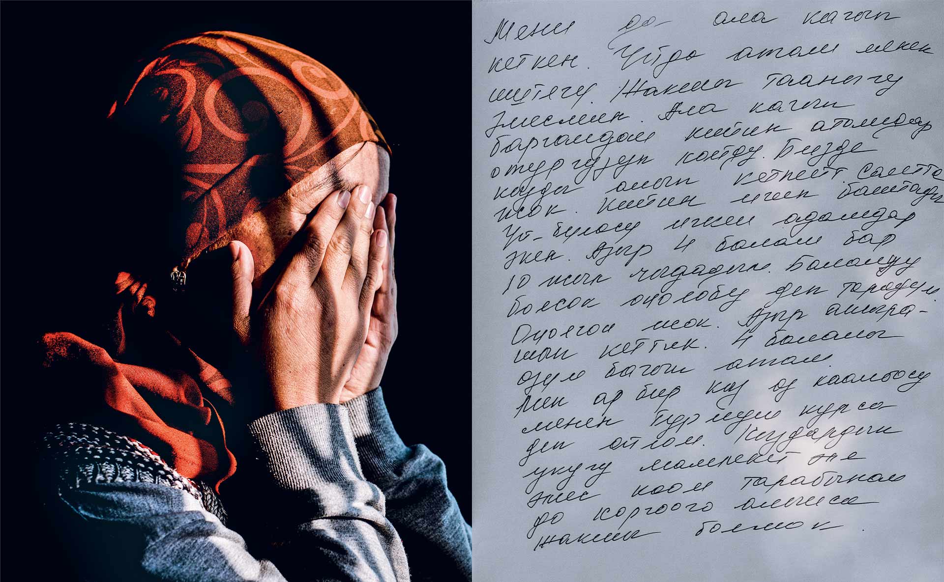 Sufrí durante diez años», escribe Meerim, la mujer que oculta su rostro y su dolor en la imagen de arriba. «Él trabajaba con mi padre. Lo conocía bien. Tras el secuestro, mi padre me obligó a quedarme con él. Según nuestra tradición, una chica no puede volver después de haber sido raptada. Empezó a beber. Sufrí durante diez años. Al final nos divorciamos; ahora crío a mis cuatro hijos yo sola. Me gustaría que todas las chicas pudieran elegir con quién se casan. La sociedad, y no solo el Gobierno, debería proteger los derechos de las mujeres».