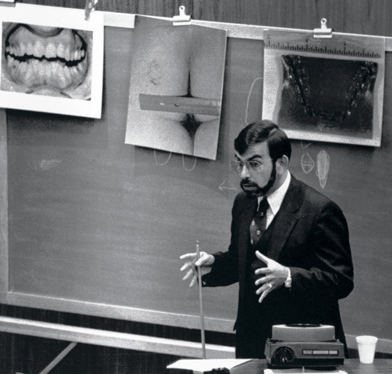 Un odontólogo forense (en la imagen anterior) declara que las marcas de mordeduras de las nalgas de una víctima coinciden con la dentadura de Ted Bundy.