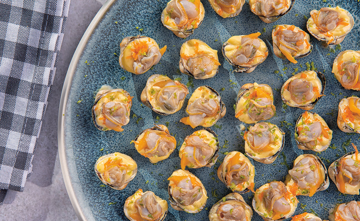 Añade en hilo fino el AOVE hasta obtener la salsa ligada. Añade el jugo de cocción de los berberechos frío hasta lograr una salsa ligera y fluida, cremosa. Rectifica de sal. Rellena cada concha con una fina capa de mahonesa. Extiende el picadillo aliñado de zanahoria y apoya encima el berberecho. Ralla al final un poco más de lima.