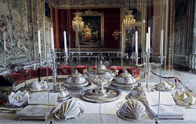 Hasta el siglo XVIII, los platos eran de metal: de oro o plata en las mesas de los ricos. De peltre (aleación de zinc, cobre y estaño), en las capas medias. Los pobres no tenían: comían de la olla. Había tenedores, pero solo se usaban para servir. Luis XIV y sus invitados comían con las manos. Los cuchillos eran redondeados para que no sirvieran como armas. Los vasos no se colocaban en la mesa: a los ricos les abastecían de bebida sus lacayos; los pobres bebían de las jarras de barro.