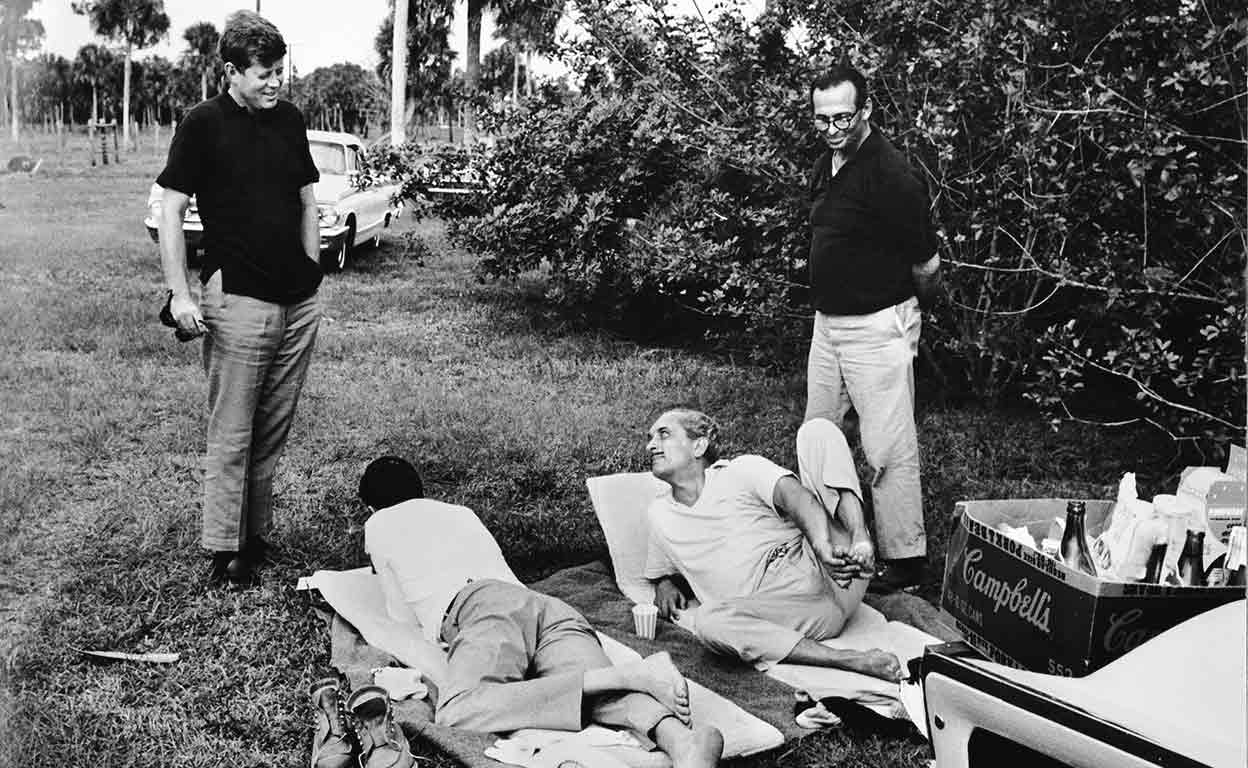 Un paseo por el campo.Spalding (tumbado) fue compañero de habitación de Kennedy en Harvard y le presentó a Jacobson (con la jeringuilla), que lo asiste a él y a Radziwill después de una travesía de 80 kilómetros por el campo en Miami en 1963.@MPTV.