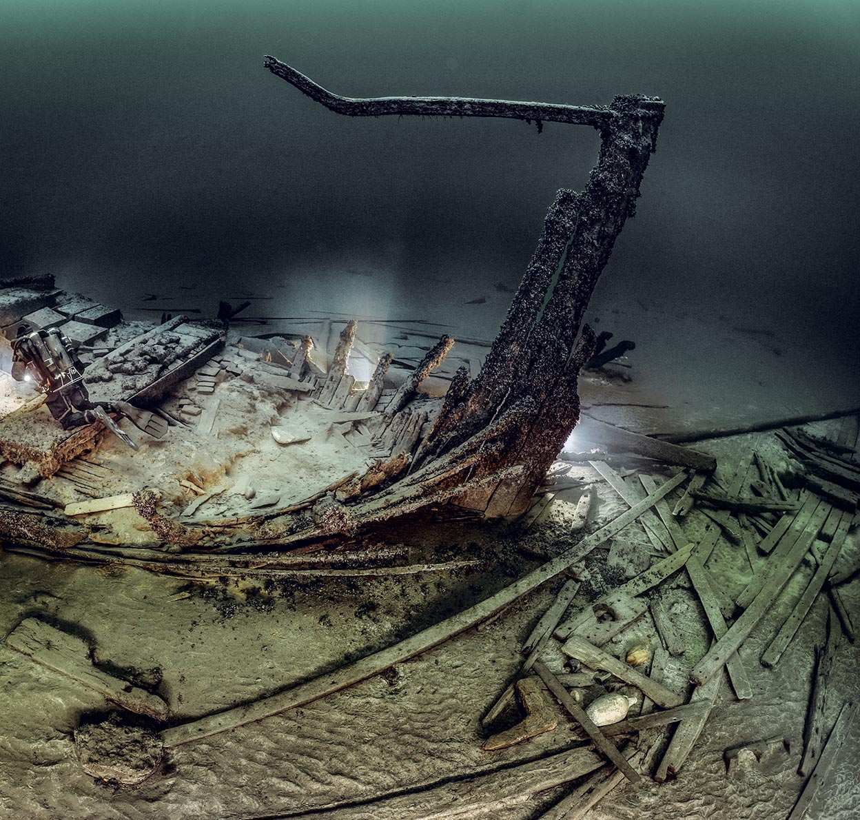 Las tormentas violentas y repentinas, los bajíos traicioneros o los enfrentamientos navales entre las naciones costeras del Báltico han llevado a su lecho marino durante siglos a buques de todo tipo. Como el agua es muy fría, los pecios se conservan allí muy bien. El barco de la foto es del siglo XVI, lo han podido datar por las características de su proa y su ancla.
