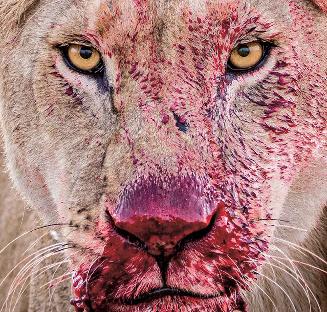 En cuanto lo tuvo en el suelo, empezó a devorarlo. Todavía se debatía la víctima entre la vida y la muerte cuando la leona miró a la cámara de la fotógrafa. Una mirada penetrante, la sangre goteando de su hocico... apenas un segundo antes de volver a su presa.