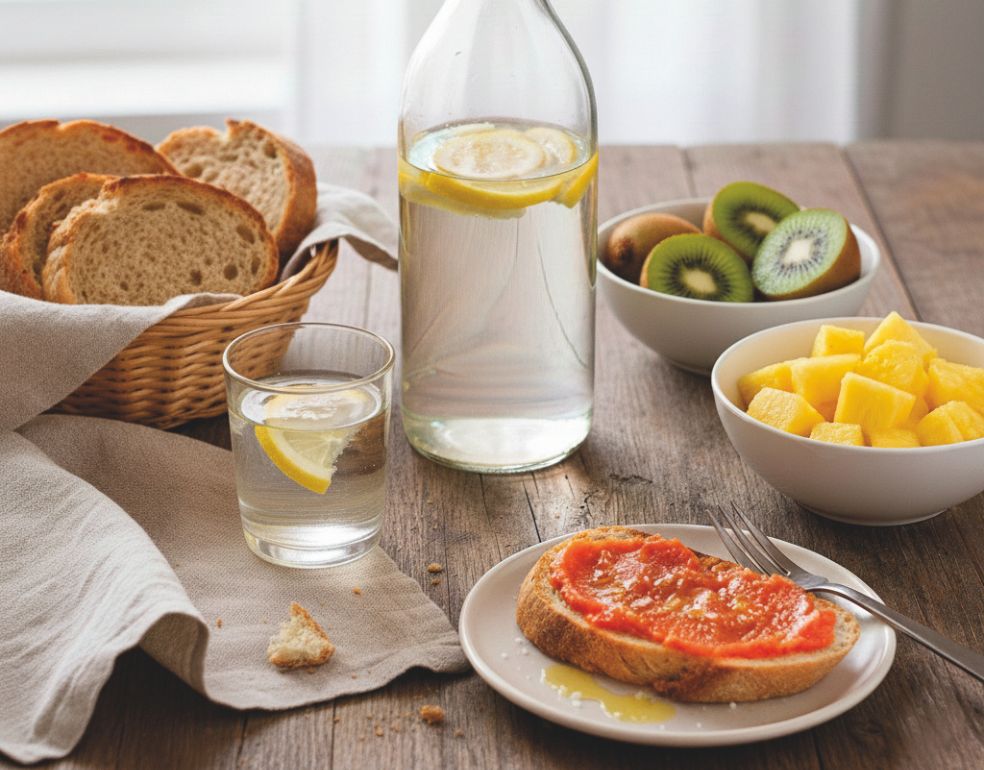 «Medio litro de agua tibia con zumo de limón para limpiar el hígado. Un kiwi, algo de piña y unas rebanadas de pan con aceite, sal y tomate frito casero».