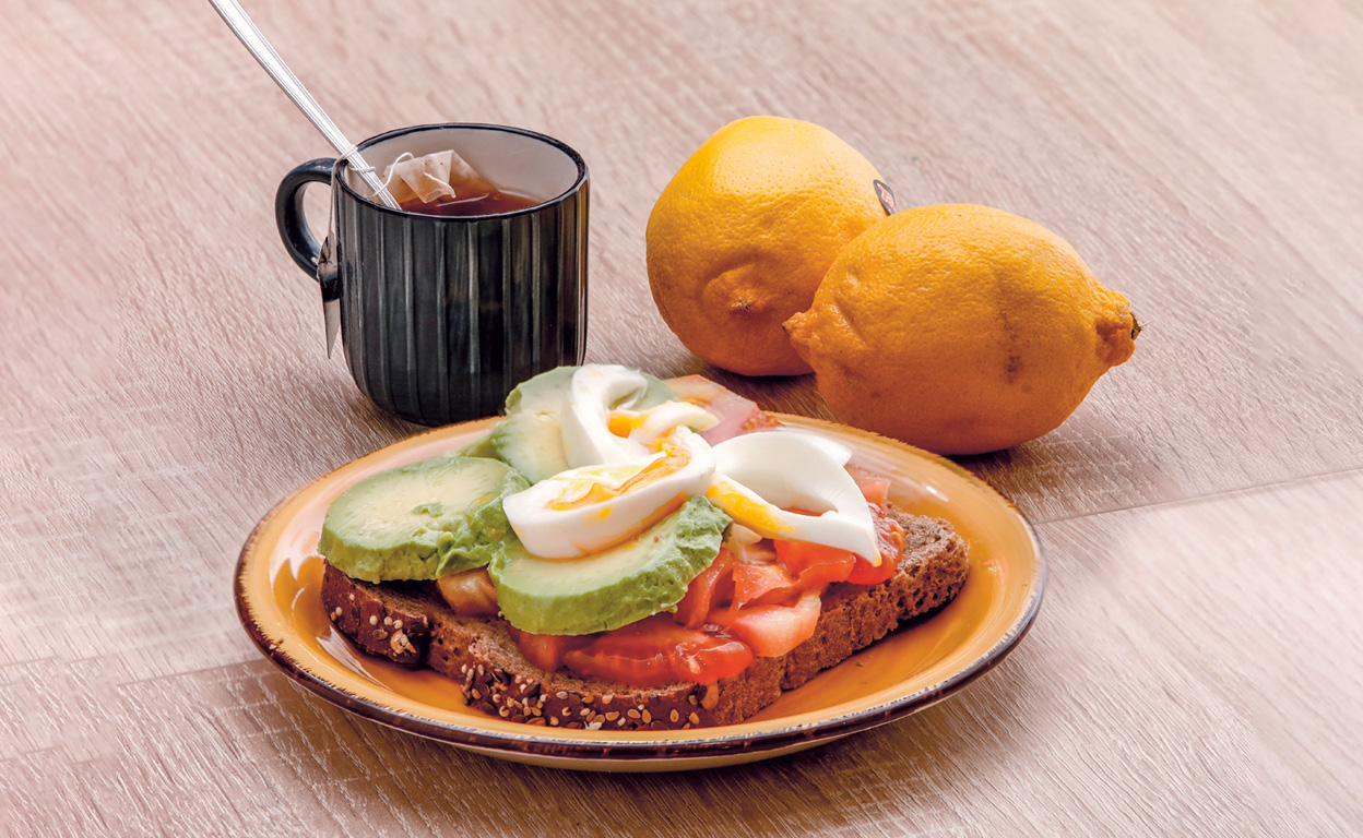 «Un zumo de limón. Pan alemán tostado con huevos revueltos, aguacate, jamón y tomate. Y un cacao con avellanas o un té chai con leche de arroz y canela».