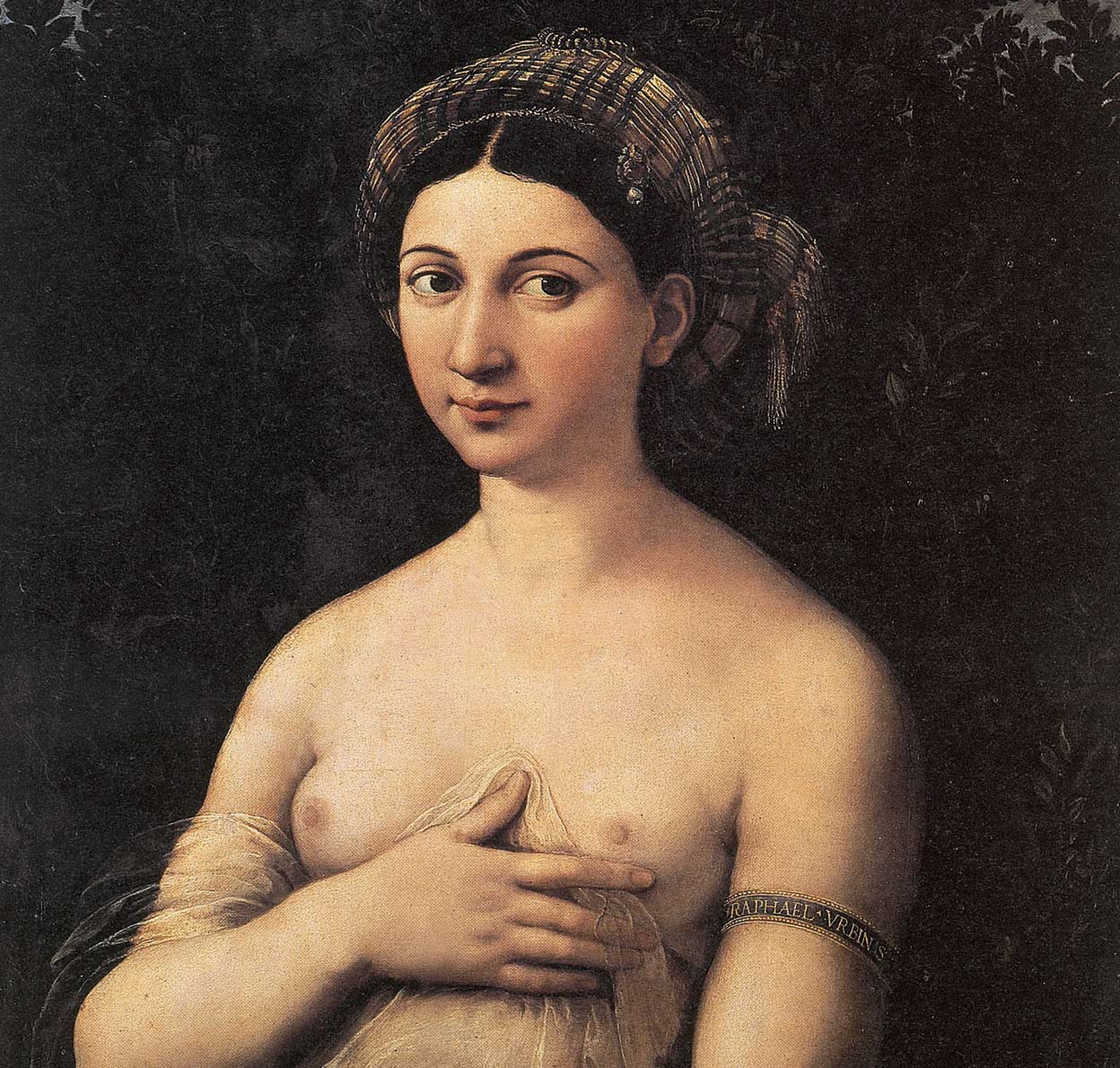 Según el historiador Giorgio Vasari, Rafael «mantuvo sus aventuras amorosas secretas y se entregó a los placeres sin moderación». Una de sus musas fue La Fornarina, la hija del panadero, quien era, según Vasari, Margherita Luti, una de sus amantes y una mujer muy popular en Roma. El hecho de que posara semidesnuda sugiere la relación. En el cuadro Retrato de una joven, también coocido como La Fornarina, (en la imagen superior) el brazalete de la mujer lleva inscrito el nombre del pintor.